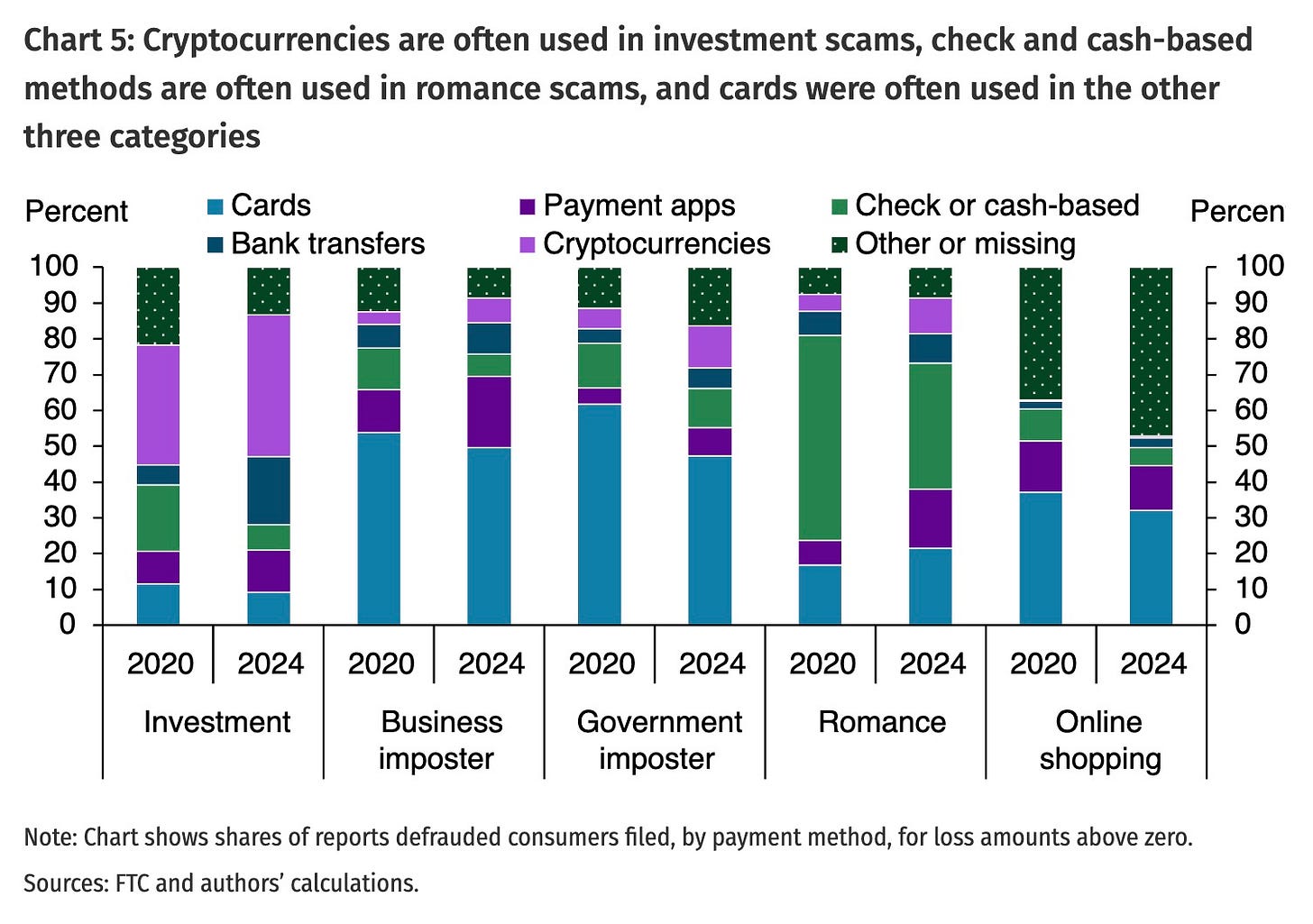 Scammers are increasingly shifting from traditional payment methods like checks, cash, and cards toward bank transfers, cryptocurrencies and payment apps, driven by factors such as Bitcoin ATMs and the popularity of digital payments, according to a report from the Federal Reserve Bank of Kansas City citing U.S.-wide data. In 2024, bank transfers accounted for the highest or second-highest share of losses across all top five scam categories, with average losses per report highest for bank transfers ($44,000) and cryptocurrencies ($30,000).