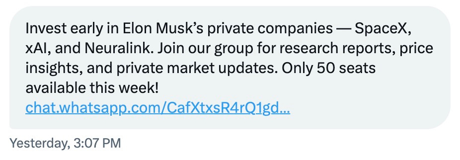Another Elon Musk-themed scam, this time through a network of Whatsapp groups called ElonTribe which is recruiting via DMs on X.